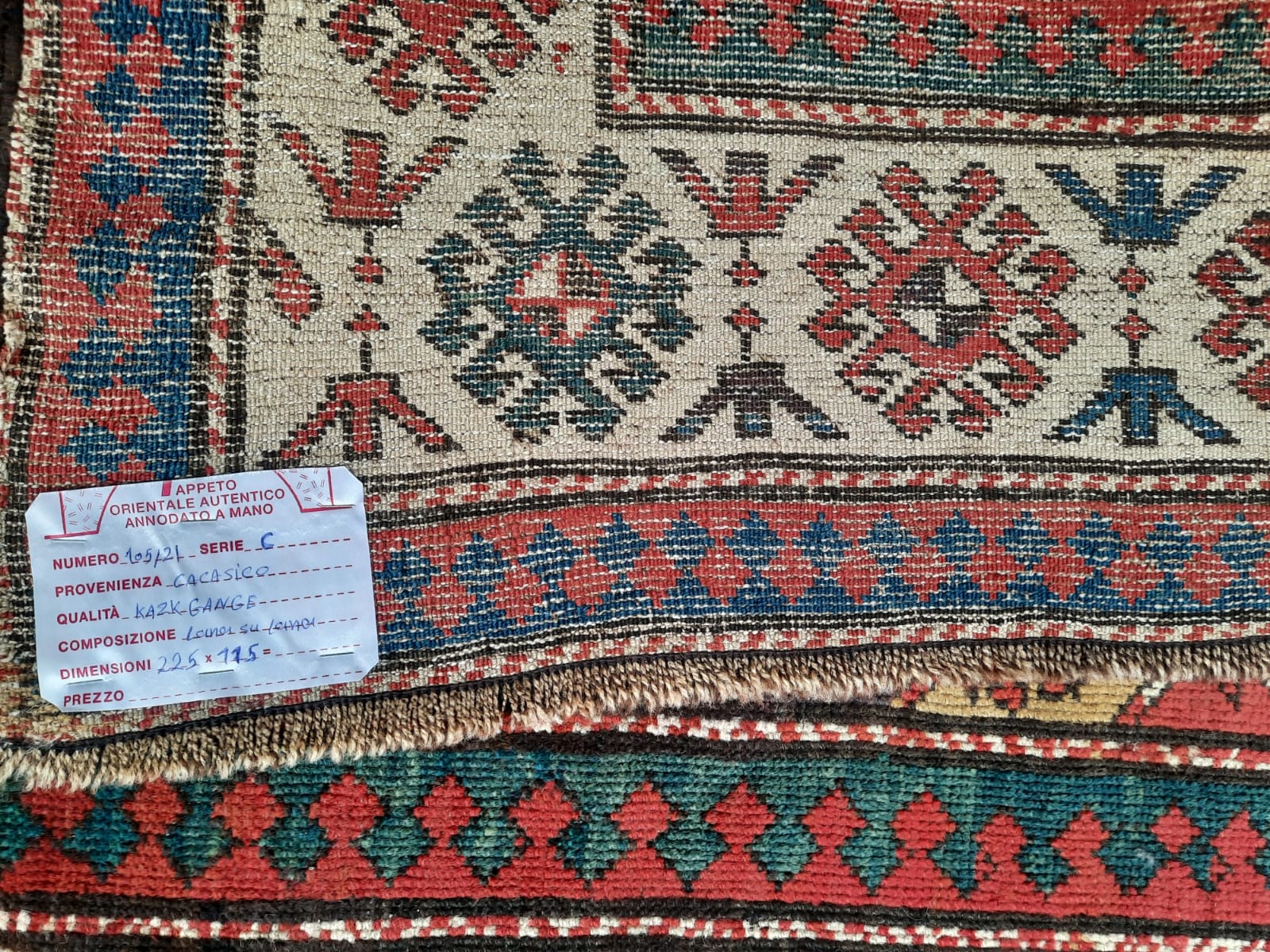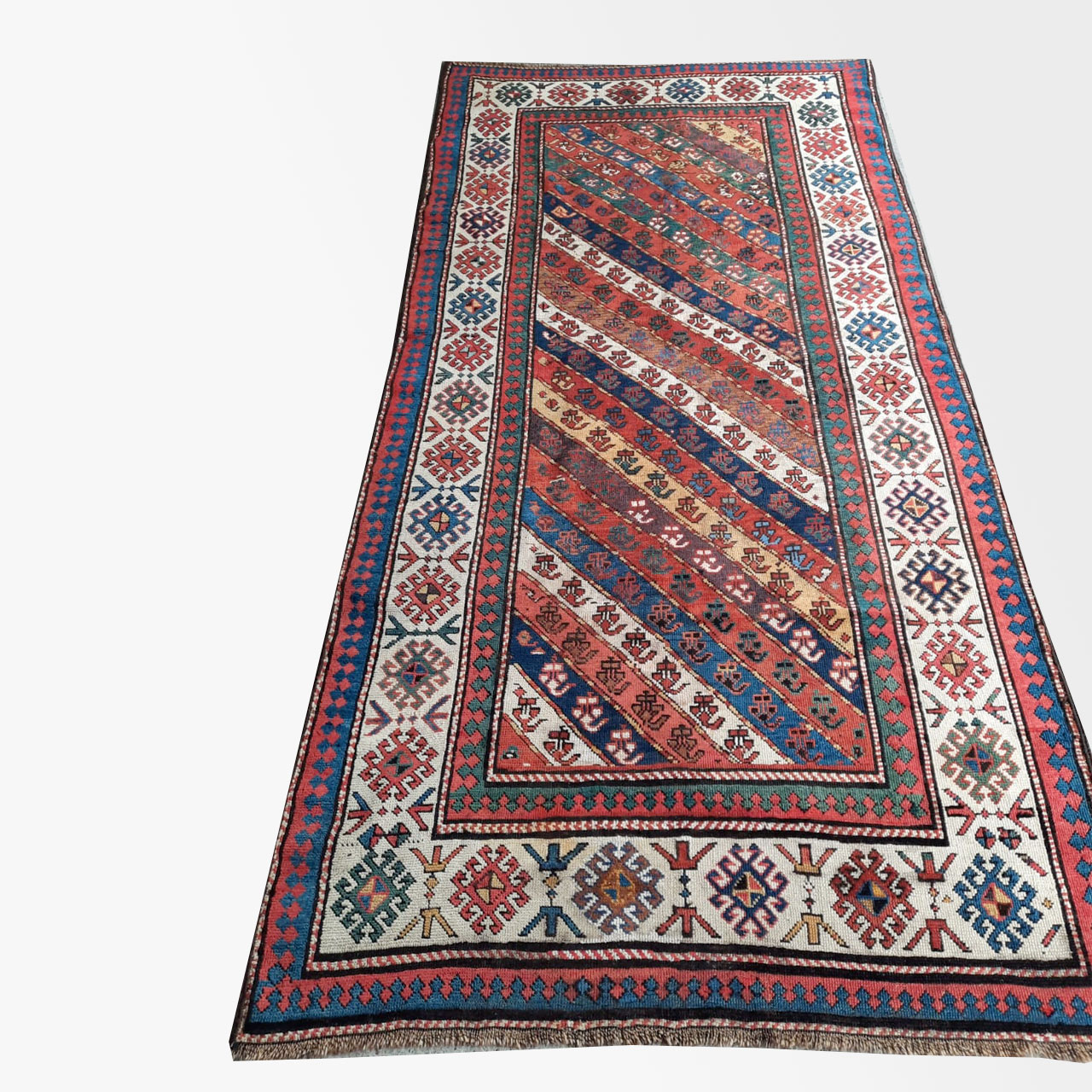 Kazak dell’800 annodato interamente in lana, tappeti dal vello lungo e lucente, dai grandi disegni colorati di tipo geometrico.