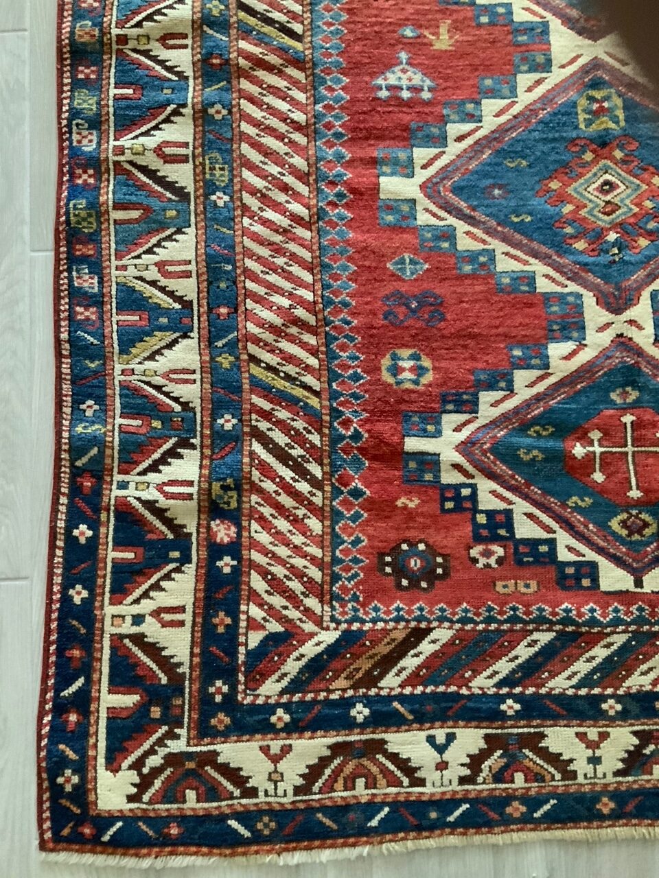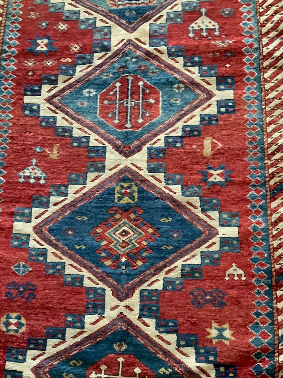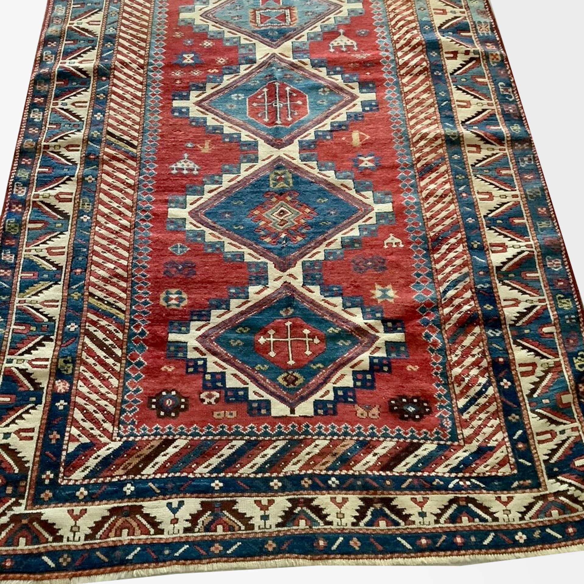 Tappeto Kazak Ganjé Antico 1870 , possiede annodatura simmetrica. La trama è in lana naturale, colore naturale o colorata con tinte che vanno dal rosso al color ecrù e blu.