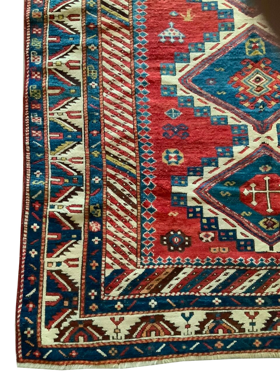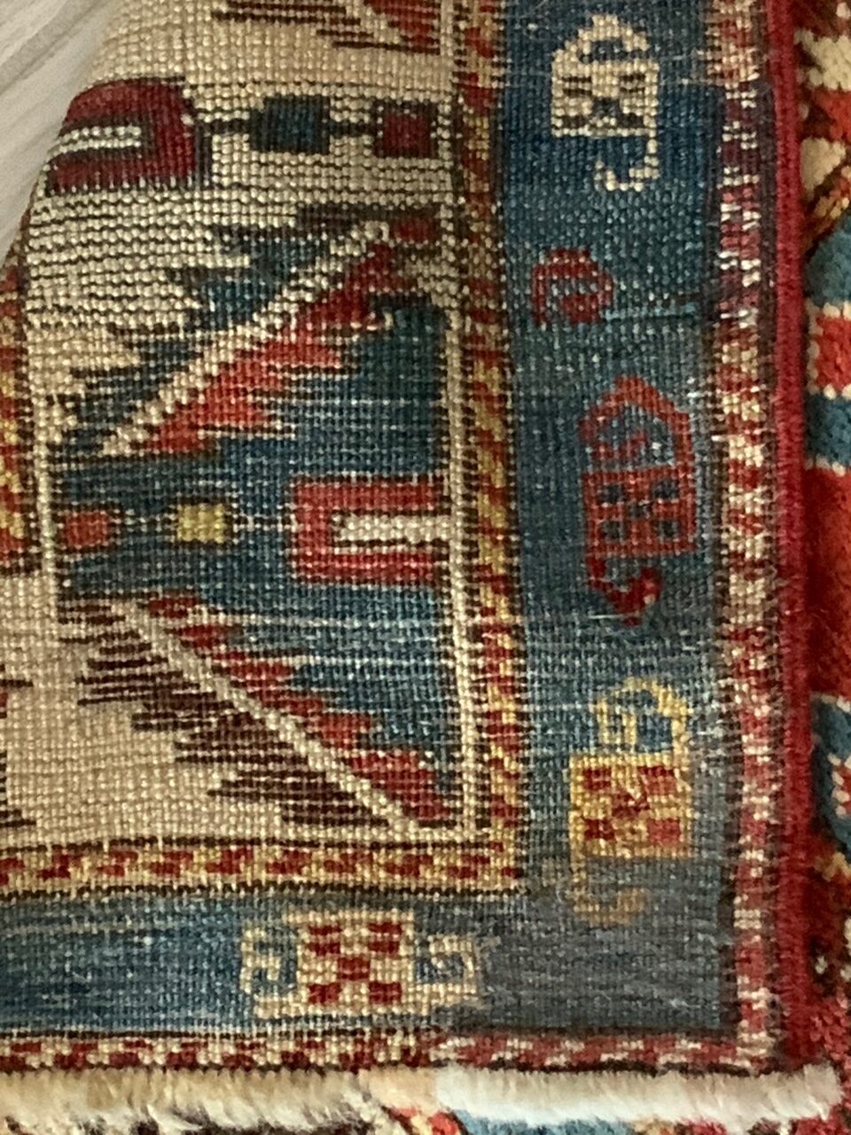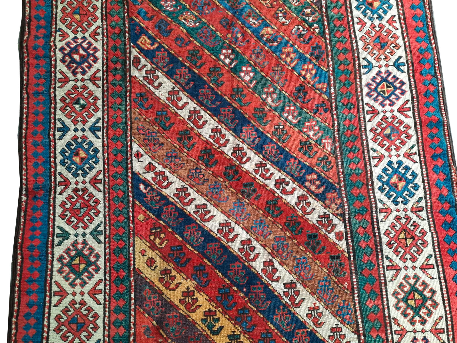 Tappeto Kazak Ganjé Antico 1870 , possiede annodatura simmetrica. La trama è in lana naturale, colore naturale o colorata con tinte che vanno dal rosso al color ecrù e blu.