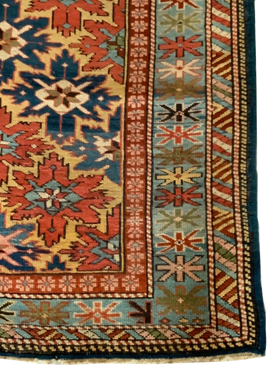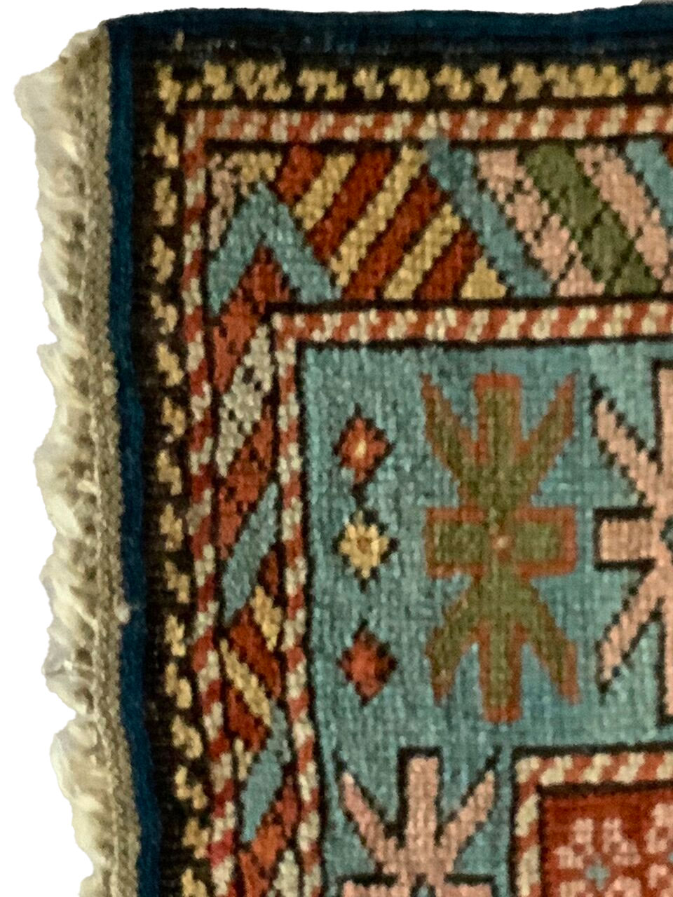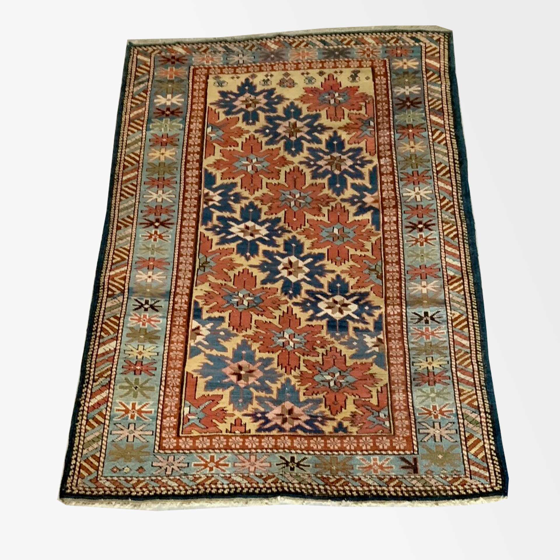 Kuba a Stelle Antico 1870, questo rigoroso elem ricorda molto i mosaici di piastrelle, sono presenti elementi a forma di stella che formano lo sfondo. Altrettanto interessante il bordo, una elegante pseudo calligrafia ornamentale.